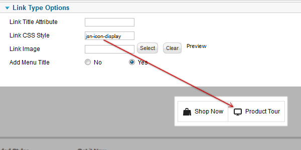 To set up icons, you need to go to menu item settings and add symbol combination jsn-icon-xxx to menu item’s parameter Link CSS Style, where xxx is the icon name.