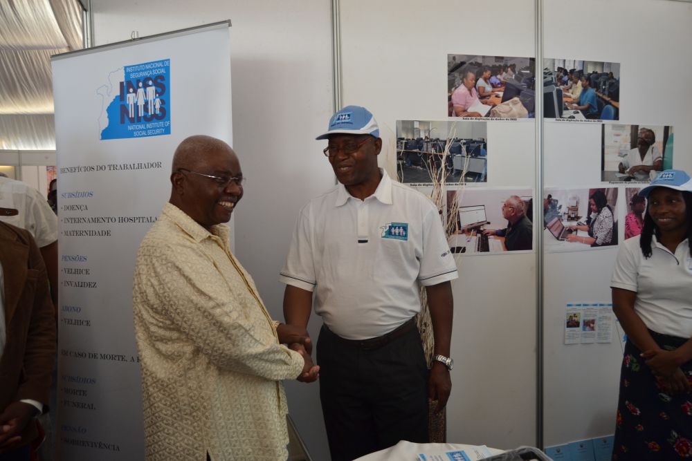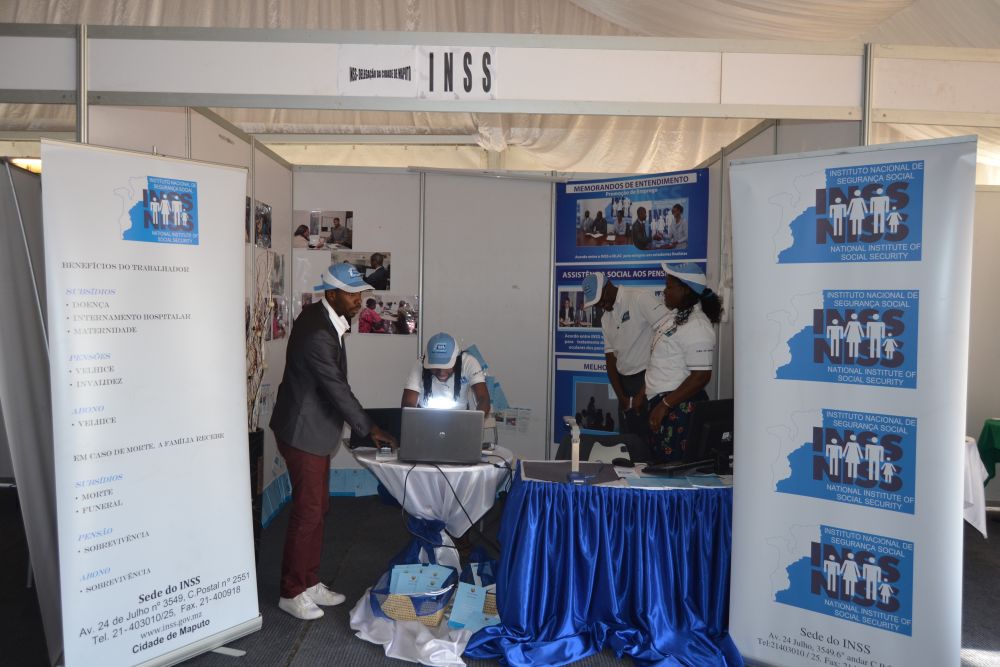 Representado por uma equipe de técnicos das Delegações Provinciais da Cidade e Província de Maputo, o INSS deu a conhecer aos visitantes sobre os serviços prestados pela instituição, bem como efectuou o cadastramento de beneficiários no Sistema de Informações da Segurança Social de Moçambique (SISSMO), criação de declaração de contribuições e emissão de guias de pagamento do SISSMO.