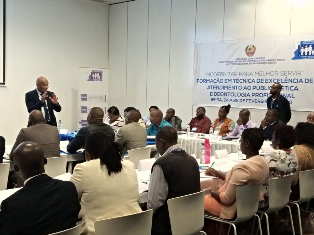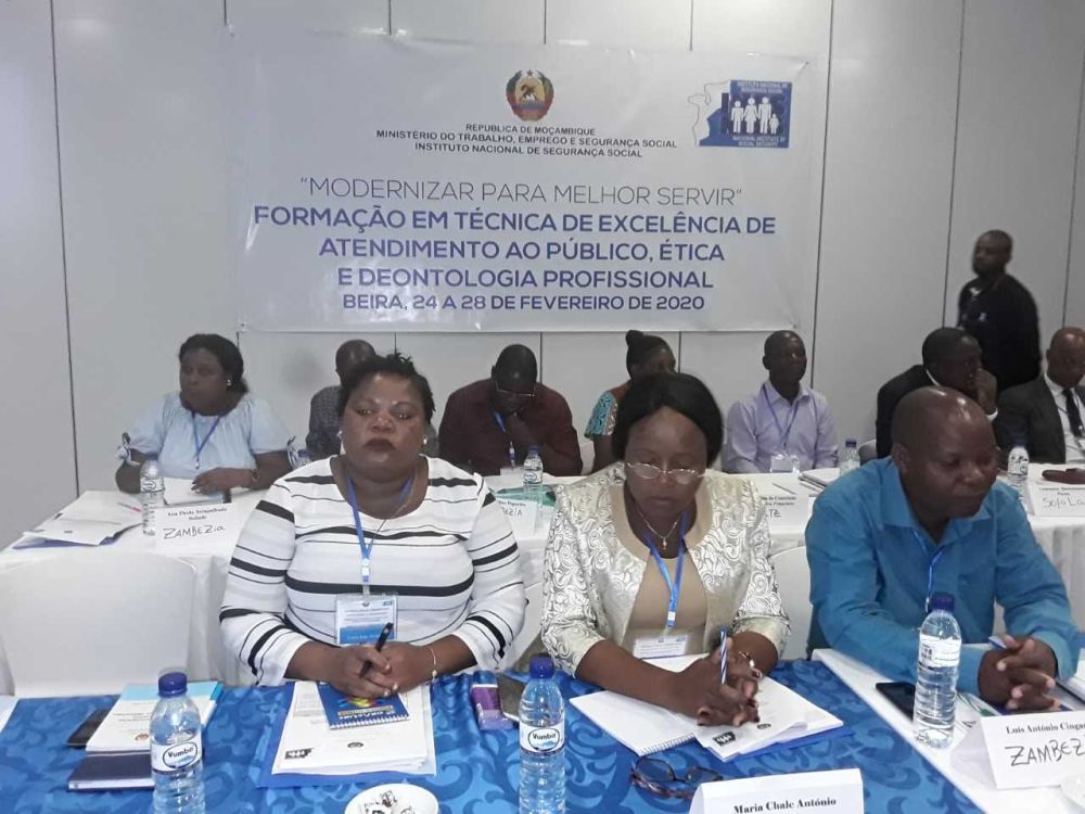 A capacitação regional centro encerra o ciclo de formação de quadros do INSS em técnicas de excelência do atendimento ao público, ética e deontologia profissional, que iniciou, na cidade de Maputo, com a capacitação de 43 formandos das delegações provinciais da zona sul, incluindo os dos Serviços Centrais e posteriormente, na cidade de Nampula, com 24 participantes dos serviços da Segurança Social da região norte.