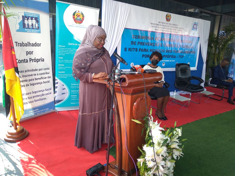 A entrega do apoio aconteceu numa cerimónia presidida pela Ministra do Trabalho e Segurança Social, Margarida Adamugy Talapa, e que contou, igualmente, com a presença da Secretária de Estado na Província de Sofala, Stela Zeca.