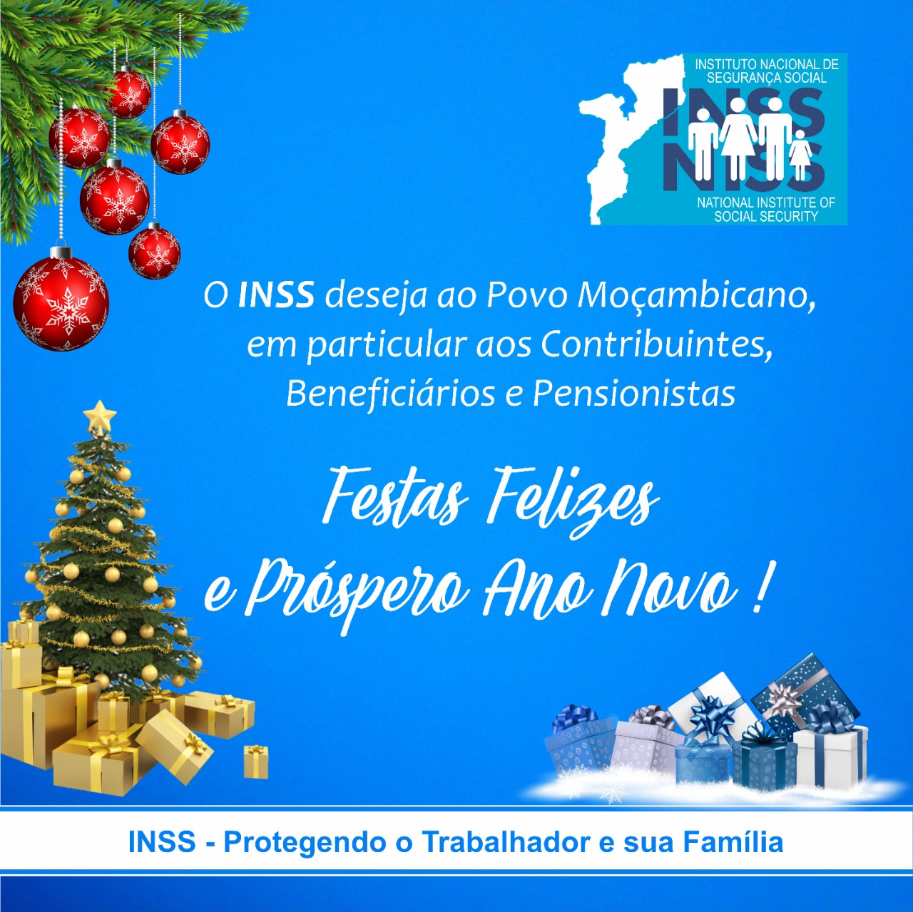 Maputo – (23/12/2022) – Por ocasião da quadra festiva, o INSS deseja ao povo moçambicano, em especial aos Contribuintes, Beneficiários e Pensionistas do Sistema de Segurança Social, festas felizes e um próspero ano novo de 2023.