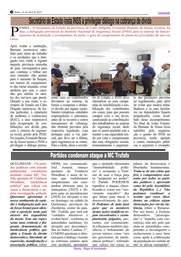 Secretário de Estado em Cabo Delgado insta INSS a privilegiar diálogo na cobrança de dívida – 16 de Abril de 2025 – Jornal Bantu